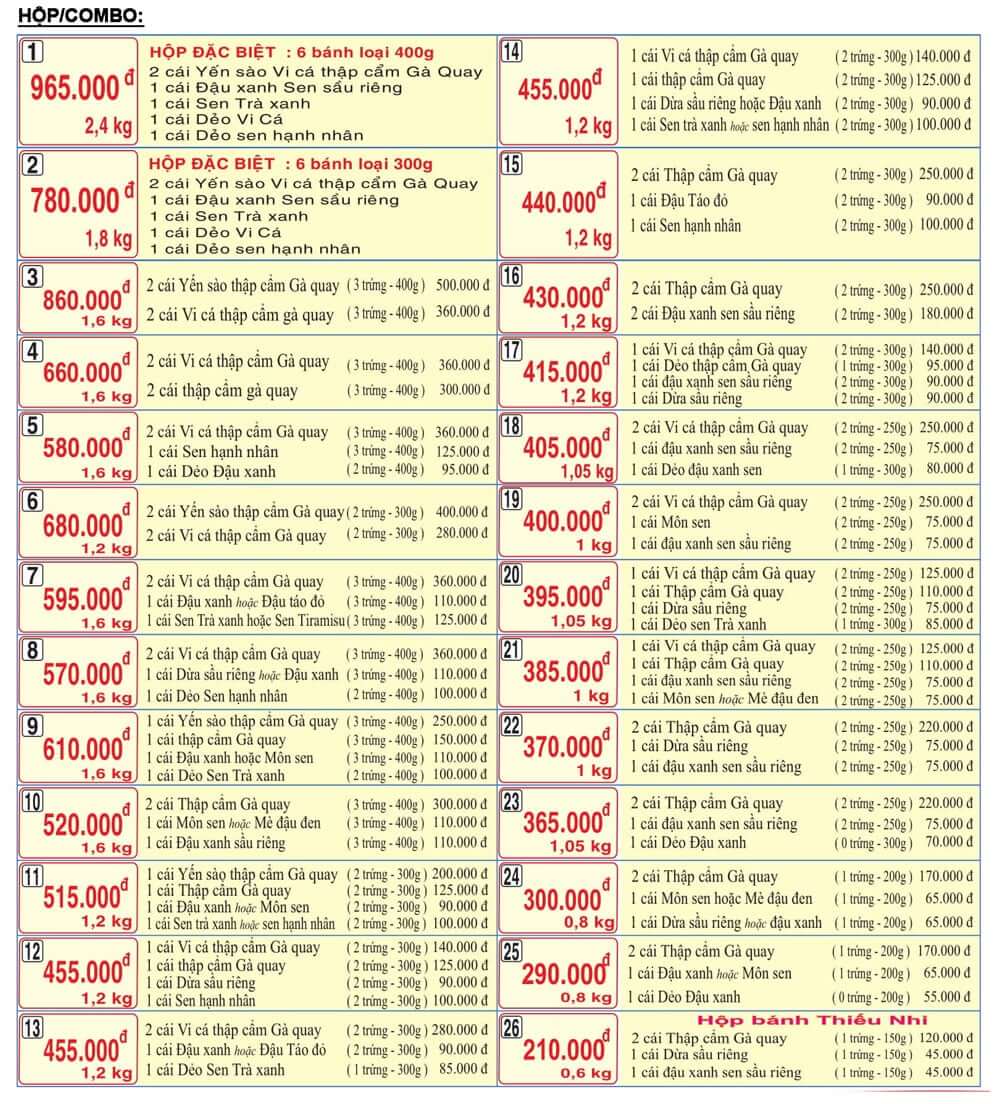 BẢNG GIÁ BÁNH TRUNG THU KINH ĐÔ