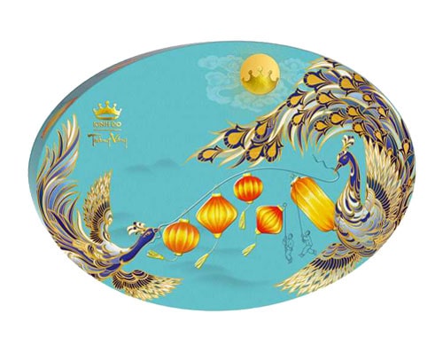 Phá cách và hiện đại với sắc xanh trẻ trung, tao nhã, vẫn giữ nét đẹp bản sắc với những họa tiết họa tiết hiện đại và thanh lịch, Trăng Vàng Pha Lê Vạn Phúc (Xanh) ẩn chứa bên trong nhiều hương vị mới lạ của hai dòng Mochi và bánh trung thu Tuyết.